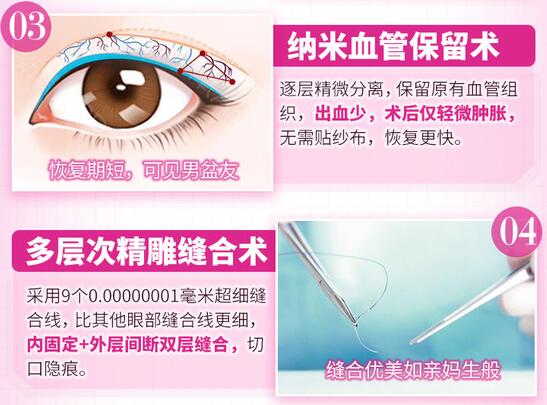 技术介绍:首先这种方式不需要手术切开,是一种眼皮部位缝合的手术,比较适合于一些双眼皮皮肤没有脂肪的患者,也比较适合于一些上眼皮皮肤较薄的患者。